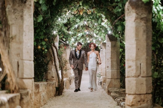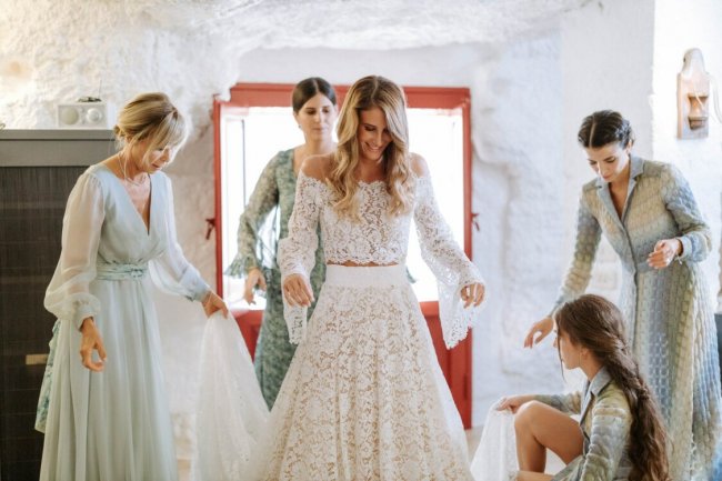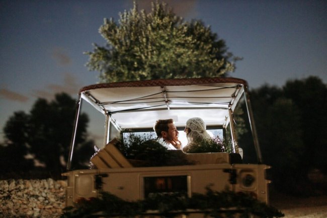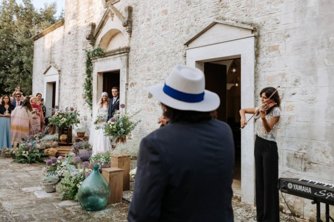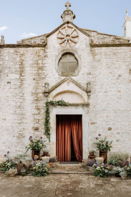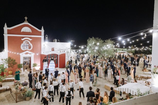 Сильвия и Джакомо хотели устроить настоящий праздник — это точно получилось. Вместо классического ужина-репетиции ( традиция, которая, как и Хеллоуин, пришла в Италию из Штатов и представляет собой ужин, организованный накануне свадьбы. — Прим. ред. ) пара организовала гонки на картинге с настоящим награждением победителей и черно-белыми гоночными костюмами. Тем временем, церемония венчания, организованная ивент-агентством Ottone Weddings (как и весь праздник), прошла в святилище Мадонны д’Иберния в Чистернино. Любой, кто был ранее в долине Итрии, знает о красоте этого места.