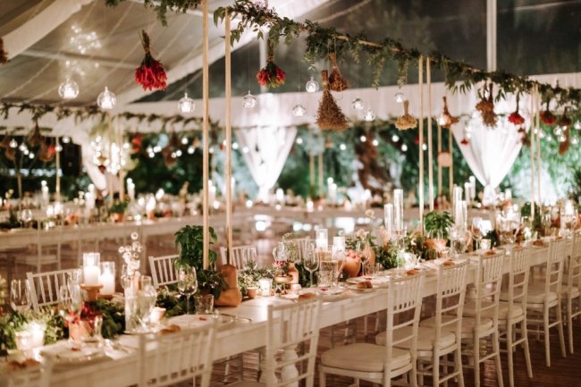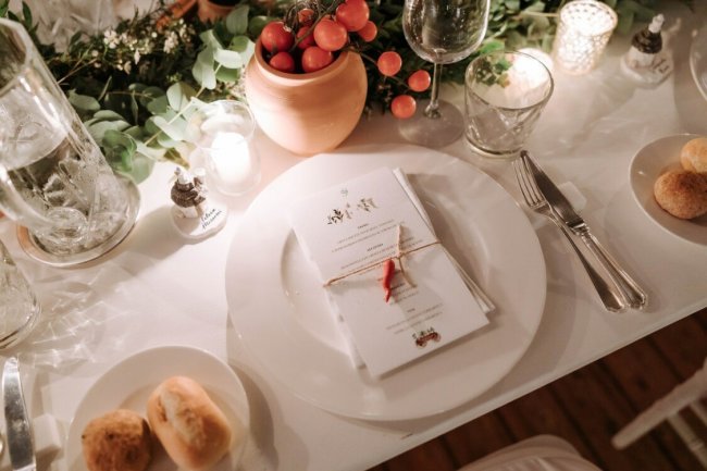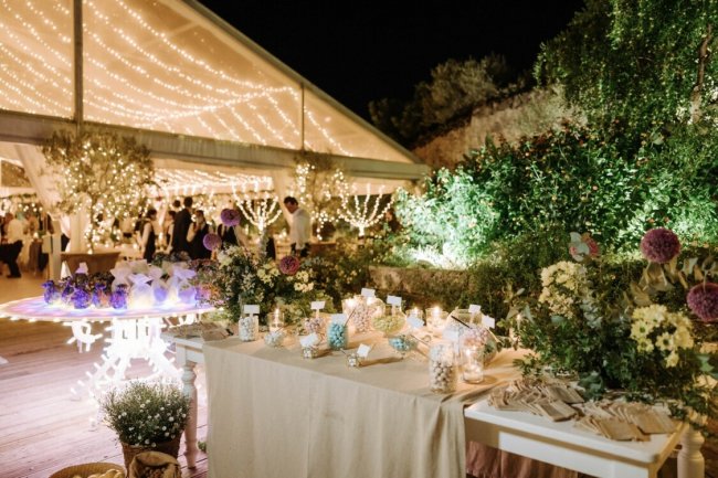 Важную роль в мизансцене, как и на церемонии венчания, сыграли любимые цветы невесты, которые были подвешены над длинными столами, подчеркивая загородный шарм свадьбы. Ароматические растения, типичные для апулийских огородов, дали название столам: лавр, тимьян, розмарин, перец чили, шалфей. Цель была достигнута - цветы окутали гостей типичными ароматами этой земли. Все было продумано до мелочей — за это спасибо команде Ottone Weddings, которая взяла на себя все вопросы по организации вечера.
