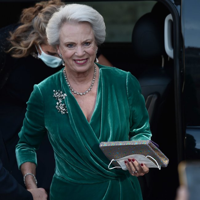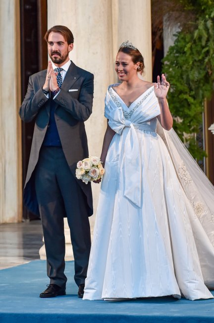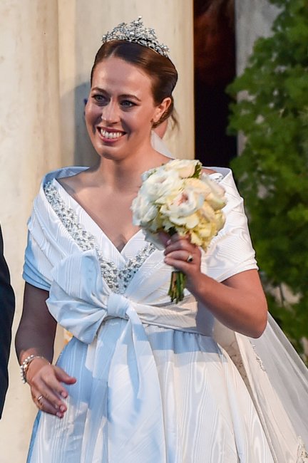 В качестве свадебного платья невеста выбрала образ из белой шелковой муаровой тафты из коллекции Chanel осень-зима 2021/2022. Платье было украшено длинным шлейфом, тюлевой вуалью, нежной вышивкой из кристаллов и бантом на груди. Свой образ невеста завершила бриллиантовой тиарой скандинавского происхождения, которую королева Анна-Мария унаследовала за несколько недель до своей свадьбы с королем Константином.