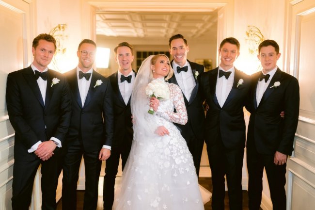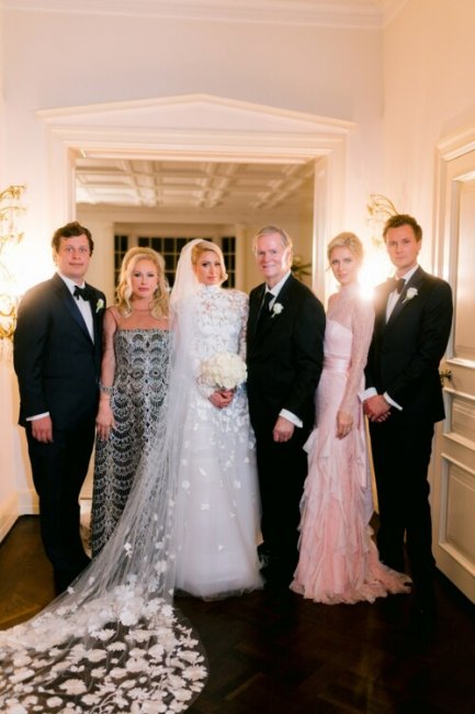 Подружки невесты, среди которых были Тесса Хилтон, Халле Реум, Брук Бринсон, Уитни Дэвис, Фарра Альджуфри надели розовые шелковые платья Alice + Olivia, а роль фрейлины исполнила сестра Пэрис Никки (тоже в платье Alice + Olivia). Тем временем, сам жених выбрал темно-синий шелковый однобортный смокинг Ermenegildo Zegna. Для друзей жениха сшили смокинги Nigel Curtiss, которые дополняли туфли Scarosso, галстуки-бабочки Shawn Christopher, носки Dead Soxy и запонки Cartier. «В детстве я всегда говорила себе, что выйду замуж в поместье моего деда. Я представила, как устрою здесь свою сказочную свадьбу, и удивительно, что моя мечта сбылась. Это место вызывает столько воспоминаний— и быть здесь в окружении близких людей много значит для меня».