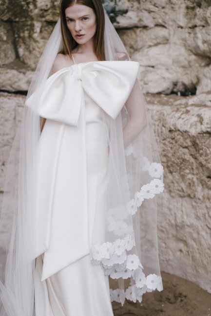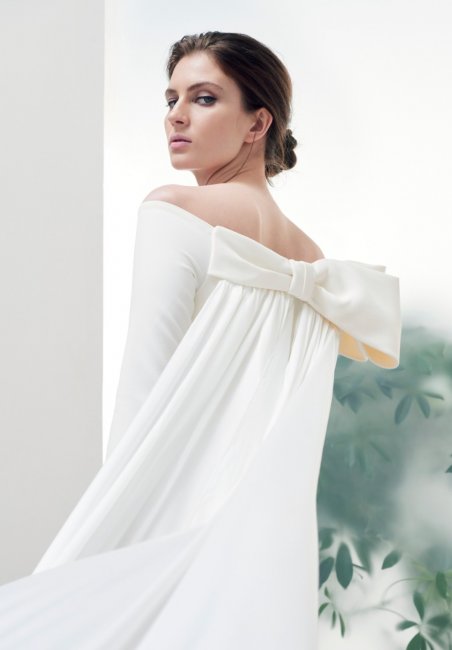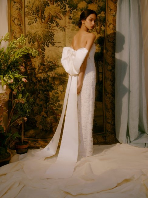 BertaБанты во всевозможных вариациях украшают свадебные образы в этом сезоне. Berta показали воздушное платье из полупрозрачной ткани с легкими бантами на плечах, которые красиво развеваются в движении, Markarian декорировали кружевное силуэтное платье крупным бантом на спине, который выполняет роль шлейфа, а Oscar de la Renta предложили эффектное мини со сборками и пышным декором у левого плеча. Одно из самых красивых свадебных платьев этой весны показали Viktor & Rolf - минималистичный образ из белоснежного крепа с открытой спиной и длинными рукавами, на пояснице которого разместился объемный бант.