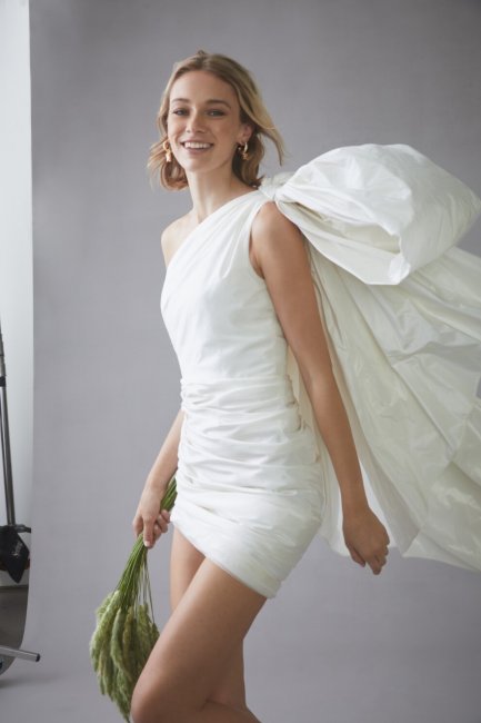 AmsaleО невестах, которые предпочитают свадебным платьям брючные костюмы или комбинезоны, дизайнеры также позаботились в новом сезоне. Например, Kaviar Gauche предложили атласный комбинезон в длине мини с большим бантом на груди и съемной юбкой в пол, а Viktor & Rolf украсили элегантный образ аккуратным и утонченным декором на талии.