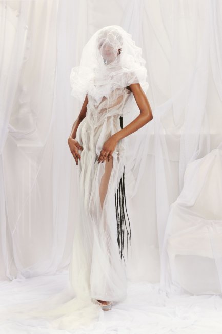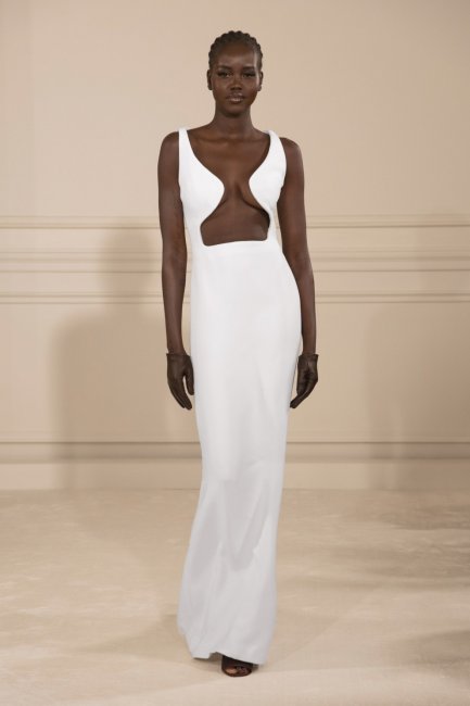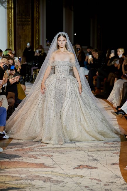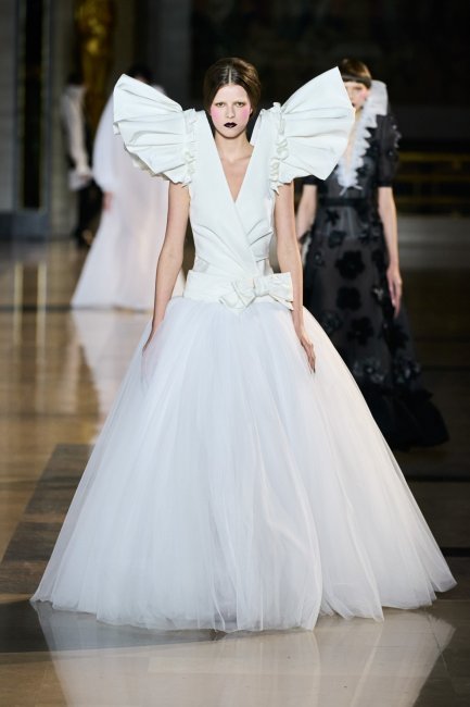 Elie SaabВ кутюрных коллекциях весна-лето 2022 было очень много тюля, нежные облака этого невесомого материала буквально обнимали плечи моделей и ниспадали роскошными шлейфами. Giambattista Valli предложили несколько романтичных образов, один из которых нам особенно запомнился – асимметричное белое платье с многоярусной юбкой из тюля и двумя изысканными бантами на груди. Тем временем, Jean Paul Gaultier показали силуэтное полупрозрачное платье, сшитое из нескольких кусочков мягкой ткани, а Ashi Studio украсили свадебное мини воздушным кейпом из тюля.