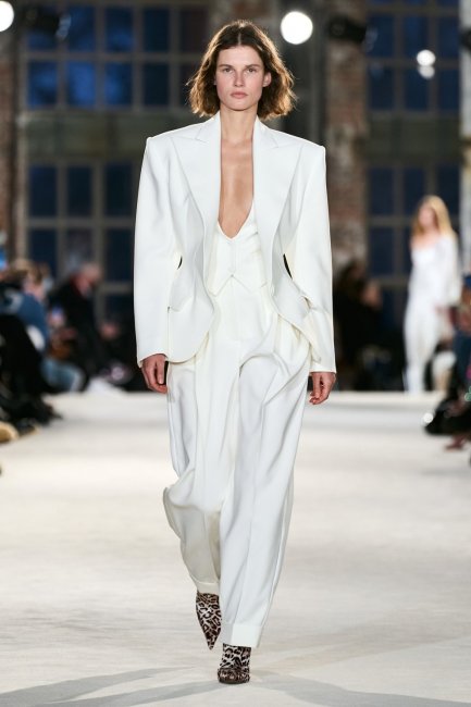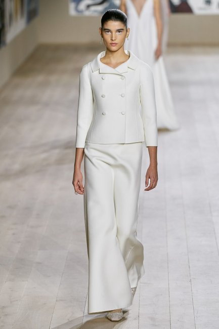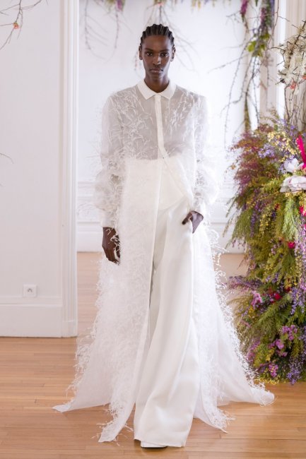 Christian DiorПомимо свадебных платьев, в этом сезоне дизайнеры одевают будущих невест в белые брючные костюмы, которые будут смотреться не менее привлекательно на торжестве. Alexandre Vauthier показали костюм-тройку, состоящий из струящихся брюк палаццо, приталенного жилета с глубоким вырезом и жакета с объемными плечами. Christian Dior представили более женственный силуэт, который понравится поклонницам классики – фирменный двубортный жакет Bar и широкие брюки. Один из самых запоминающихся свадебных образов появился в коллекции Ashi Studio, изюминкой которого стала полупрозрачная блуза в длине макси, полностью расшитая перьями.