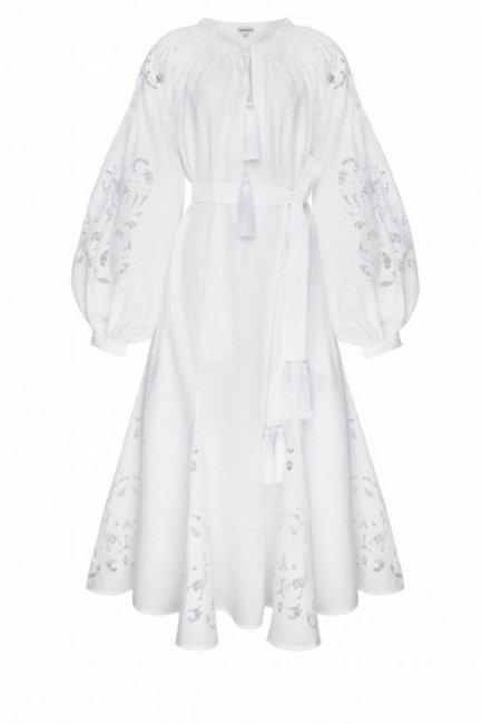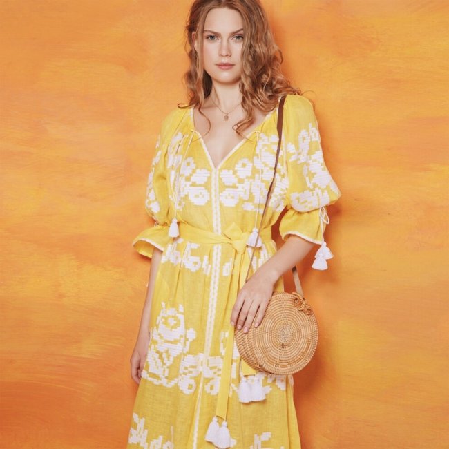 Сукня Olives, Yuliya MagdychПомітні й експерименти з кольором тканин. Хоча полотно природного світлого, білого кольору є найкращим тлом для будь-якої вишивки, наразі також спостерігається тенденція на вишиванки в різних кольорах – червоному, жовтому, синьому й навіть чорному.