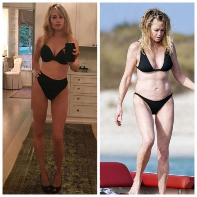 Сейчас актриса вроде остановилась, не увлекается больше инъекциями. Активно занимается спортом, правильно питается. Недавно фолловеров удивило селфи, которое Гриффит сделала в нижнем белье. В кадре актриса выглядит так, будто ей снова 30. Подтянутое тело, молодое лицо. Но в объективе папарции Мелани в купальнике выглядит на свой возраст. Так стоило ли выставлять себя на посмешище, омоложиваясь с помощью фильтров? Ведь реальные фото несложно найти в сети.