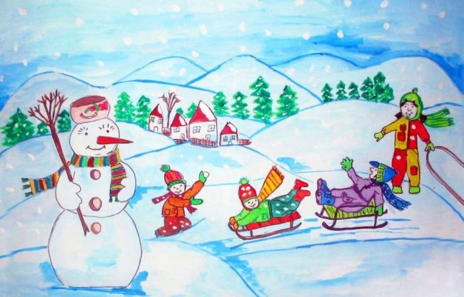 Украсить рисунок с изображением зимы можно дополнить веселящейся детворой. Такой рисунок обязательно будет вызывать приятные эмоции и ассоциации с детством. Такая идея так же хороша для рисования новогодних открыток и картинок для конкурсов и выставок.