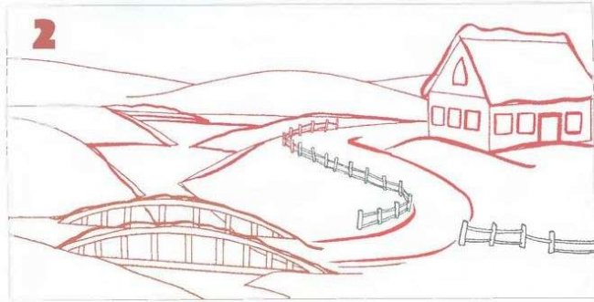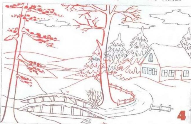 Приступите к детализации рисунка, изобразите природу: деревья, елки, тропинки и другие мелочи.