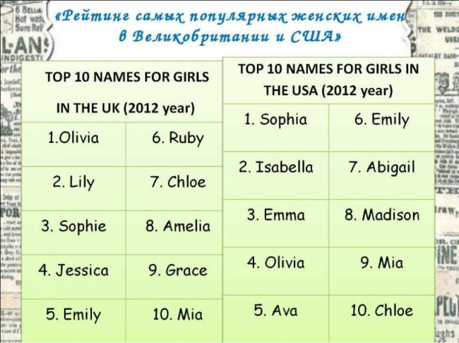 Хотя иностранные имена становятся всё более распространёнными, в нашей стране нечасто можно встретить девочку с английским именем. Вместо этого чаще используются имена, популярные как в России, так и в Европе.