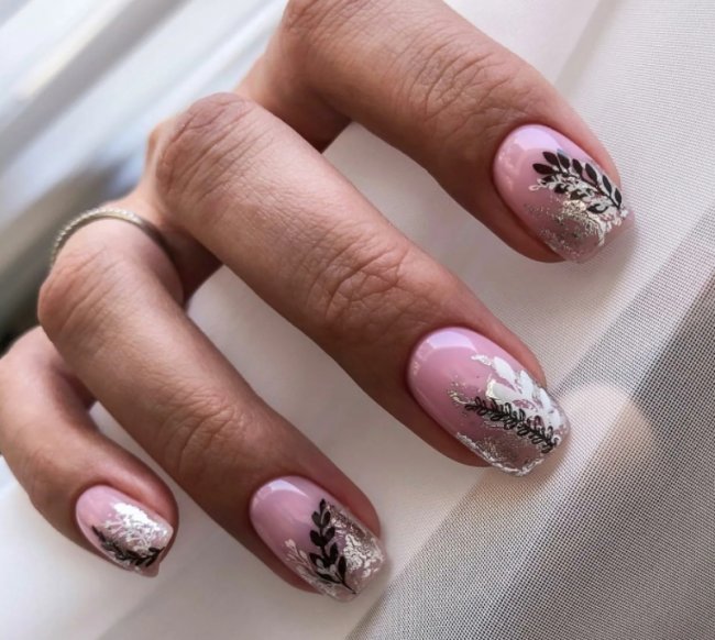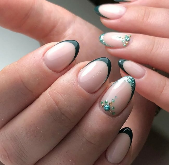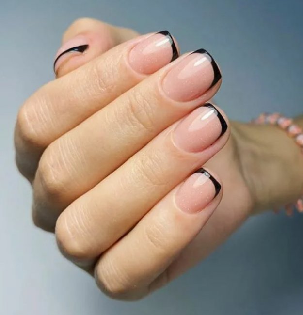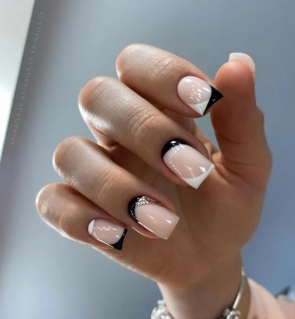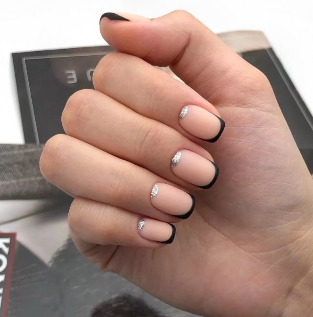 Черный френч выглядит элегантно и эксцентрично. Его обычно предпочитают деловые дамы. В моде классическое сочетание белого и черного. Эти цвета смотрятся очень гармонично. Также актуально будет сделать зеркальное оформление. Черная втирка на нюдовом фоне придаст вашему образу нотку нежности и легкого шарма.