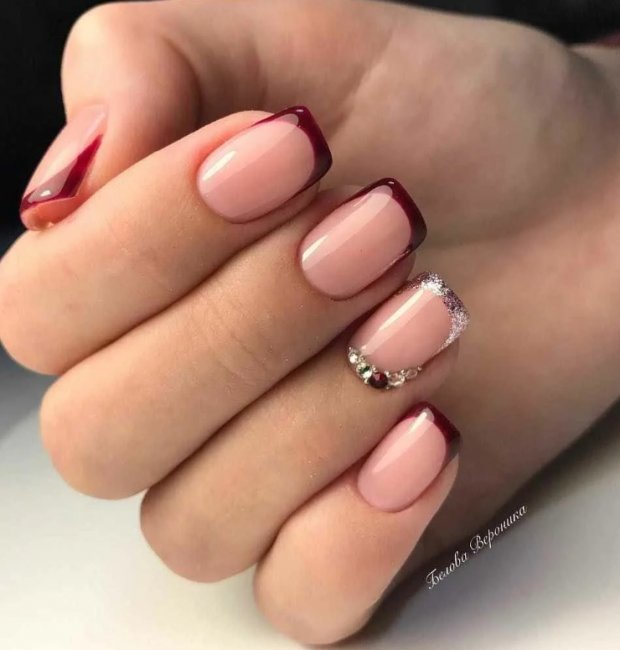Это насыщенный и невероятно привлекательный оттенок, который дамы выбирают каждую осень. Бордовый френч станет отличным дополнением к любому наряду и подойдет для любого мероприятия. Творческие девушки могут дополнить его цветами, стразами или бусинками.