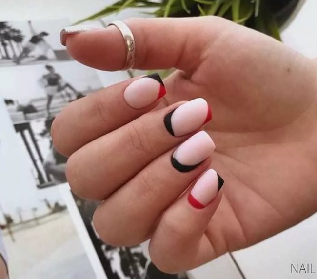 Благодаря треугольному оформлению вы сможете получить необычный и креативный вариант французского маникюра. Он подходит для смелых дам, которые любят эксперименты. Попробуйте добавить стразы и сочетать яркие цвета. С таким дизайном ногтей вы точно не останетесь без внимания.