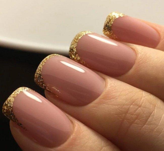 Золото всегда выглядит роскошно, дорого и богато. Именно поэтому дамы отдают предпочтение золотистым тонам. Френч в таком исполнении будет смотреться ошеломительно. Дизайн за считанные секунды будет привлекать к себе внимание. Все знакомые девушки будут завистливо вздыхать в стороне.