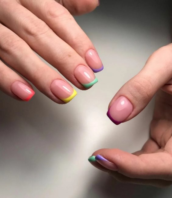 Этот вариант подойдет для ярких и эффектных девушек. Его чаще всего выбирают студентки или школьницы. Вы можете сочетать любые оттенки. В 2023 году ограничений в цветовой палитре нет. Попробуйте сделать радужный маникюр.