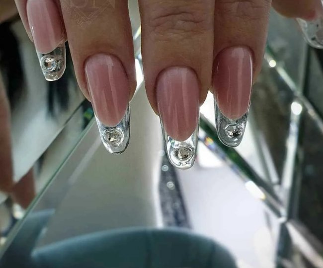 Этой осенью нейл-мастера решили удивить любительниц френча. В моде прозрачный свободный край, который напоминает стекло. Данный дизайн можно воплотить в реально исключительно на наращенных ногтях. Прозрачный край можно оформить при помощи различного декора: проволоки, камифубуки, фольги.