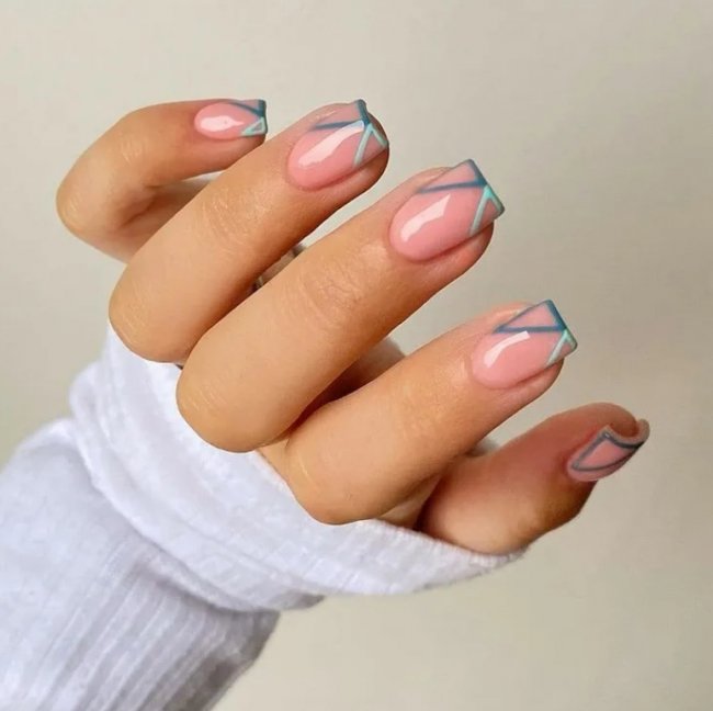 Голубой френч завоевал сердца романтичных натур. Это нежный и ненавязчивый дизайн, его любят за универсальность. Он прекрасно сочетается с геометрическими рисунками. В моде зигзаги, ромбики и квадраты. Такой вариант выглядит сдержанно и невероятно круто. Также осенью красиво будет смотреться тандем с «вязаным» маникюром, твидовой текстурой, горошком и витражами.