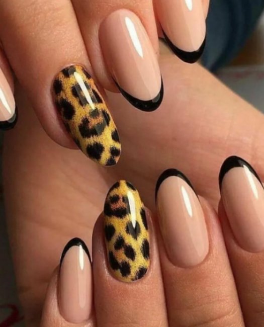 Линию «улыбки» в этом варианте покрывают узором, который напоминает кожу животных. Чаще всего девушки выбирают принт леопарда, змеи, коровы, черепахи или тигра. Смотрится такой френч ярко и молодежно. Если вы хотите выглядеть этой осенью неординарно, отдайте предпочтение такому дизайну.