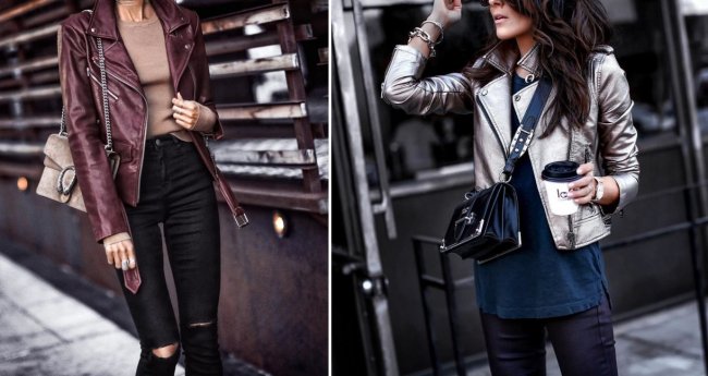 Данный вид курток отлично сочетается с платьями и ботильонами. Этот образ будет уместным и в рабочей атмосфере, и на вечеринке. А, заменив платье джинсами, можно получить неплохой наряд для ежедневных прогулок. С брюками и футболкой хорошо смотрится укороченный вид кожаных женских курток. Любительницам необычных луков подойдут короткие жакеты в сочетании с платьем или мини. Подчеркнуть фигуру поможет пояс и пышная юбка.