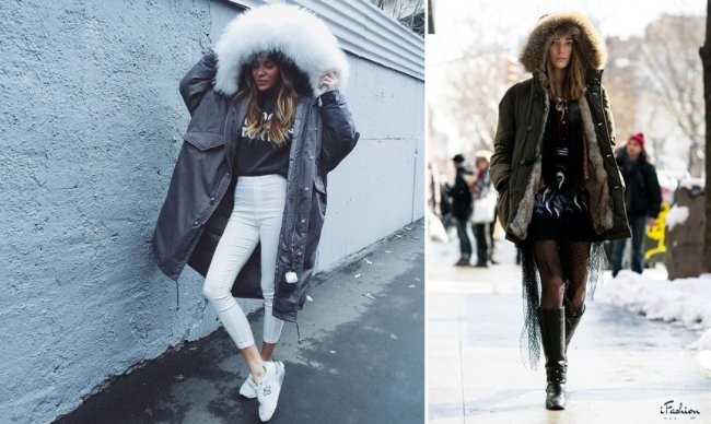 Молодым девушкам, предпочитающим спортивный стиль, дизайнеры рекомендуют выбирать парки с накладными карманами, нашивками и принтами. Они отлично подойдут к леггинсам, джинсам и кроссовкам. Деловым дамам стоит брать тонкие плащи, которые подходят под классический стиль обуви и офисный лук.