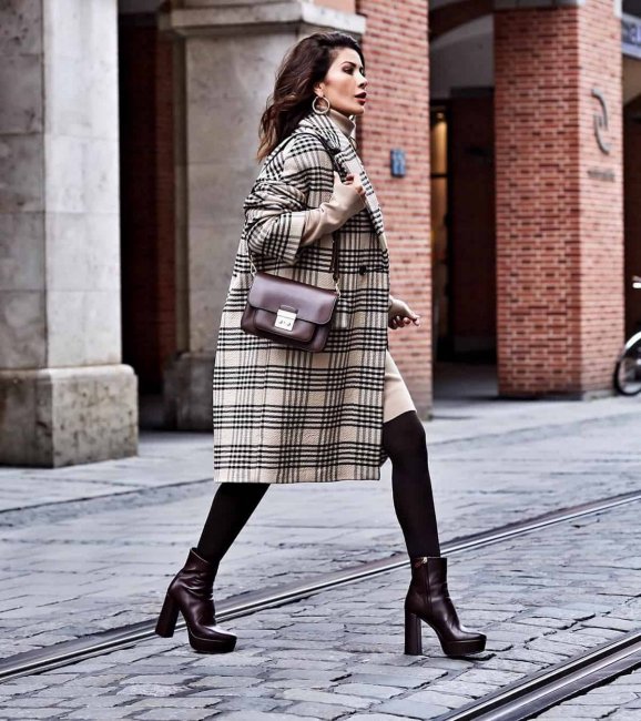 - При желании подобрать принтованную верхнюю одежду незаменимо клетчатое пальто. Рисунок создаётся в мелком или крупном варианте, сдержанной или яркой расцветке. Трендом сезона считается шахматная чёрно-белая или шотландская красно-чёрная клетка.