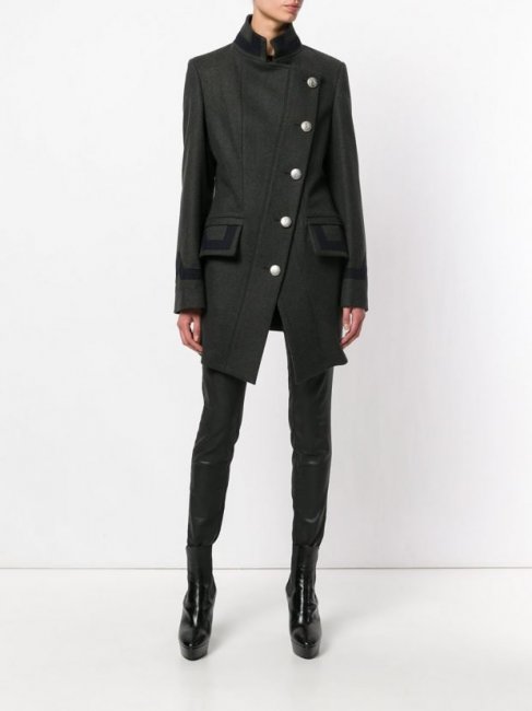 - Трендом дизайнерских коллекций стало пальто в стиле милитари. Для него свойственен двубортный крой или дополнение одним рядом крупных металлизированных пуговиц. В качестве декора зачастую применяются нашивные карманы, погоны, широкие пояса со стальными пряжками. При выборе палитры предпочтение отдаётся цвету хаки, серым, бежевым, оливковым расцветкам.