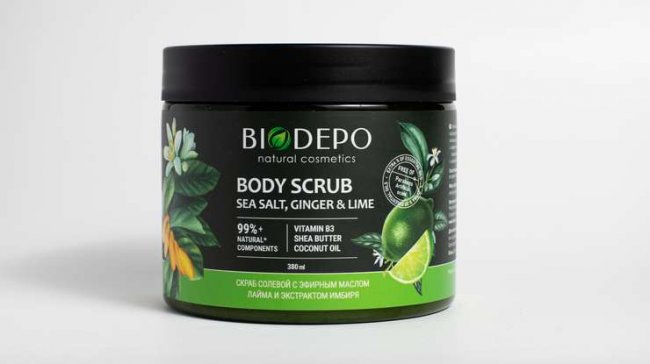Новинка от BIODEPO — Натуральный солевой скраб для тела с эфирными маслами имбиря и лайма. Как понятно из названия, за отшелушивание отвечает соль. Экстракт имбиря тонизирует, обладает омолаживающим и легким отбеливающим эффектом. Эфирное масло лайма оказывает на кожу очищающее и тонизирующее действие, контролирует выделение себума, избавляет от черных точек, стягивает поры.