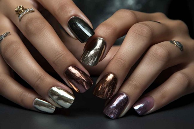 - Броские тенденции маникюра представлены в металлическом оттенке. Беспроигрышный вариант – прибегнуть к нанесению на пальцы блестящей втирки. Другое решение – обратиться к декорированию с помощью фольги. Последняя выкладывается в виде четких полосок или хаотичных абстрактных разводов потали. Металлические покрытия подбираются в серебристых, золотистых или разноцветных оттенках.
