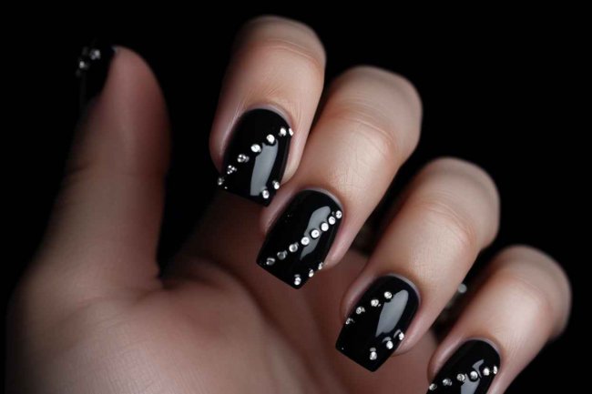 - Темные покрытия придают нейл-арту благородства и загадочности. К таким оттенкам относятся черный, темно-синий, графитовый лак. Органично смотрится дизайн «кошачий глаз», характеризующийся блестящими переливами. На темном фоне выигрышно выделяются четкие геометрические фигуры.