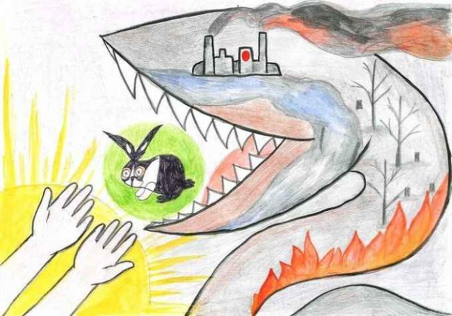 На плакате изображена акула, символизирующая антропогенное воздействие, которое уничтожает всё живое на своём пути.