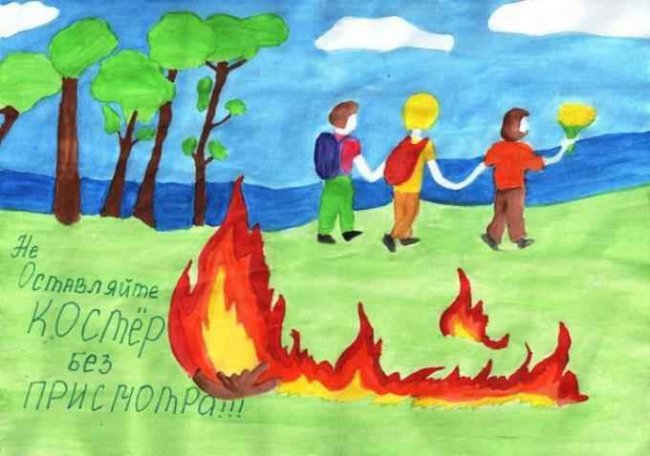 Рисунок напоминает о необходимости потушить костёр после посещения леса, чтобы предотвратить возгорание.