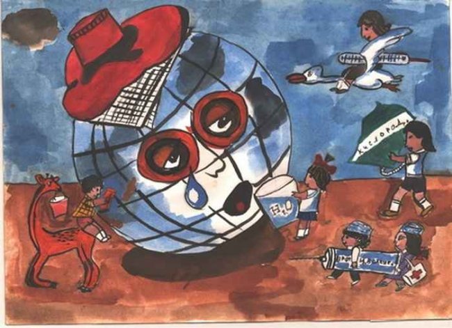 На рисунке голубь держит на своей спине планету, на которой царит мир, радость и процветание.
