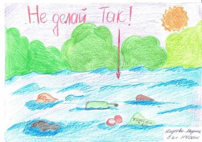 Рисунок карандашами, в котором ребенок призывает не выбрасывать мусор в водоемы.