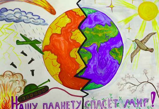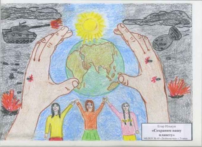 Детский рисунок призывает не вести войны на Земле. Людям и планете нужен мир.