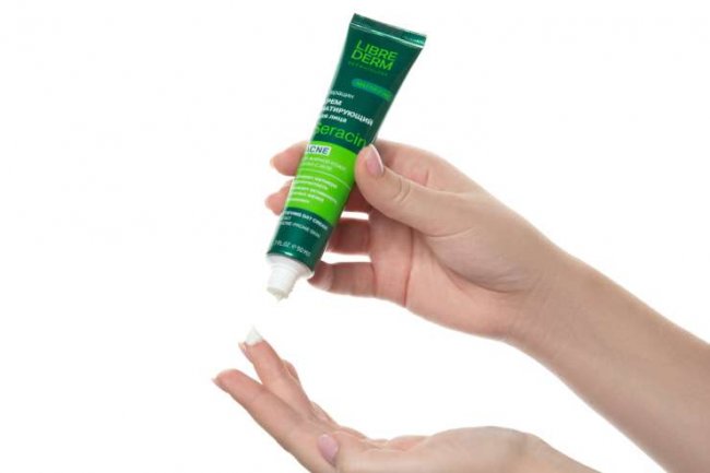Дневной матирующий крем Seracin воздействует на работу сальных желез за счет серы, цинка и себорегулирующего компонента на основе молочного протеина.